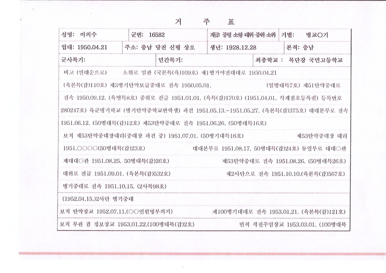 * 선친 故 李義秀 본관 全州 (예) 육군 대령/ 군번 16582