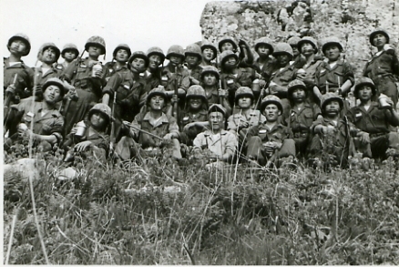 天子峰 상투바위 앞의 사관후보생들(해간 22기생 1955년 앞줄중앙, 이근식 소령, 중대장)