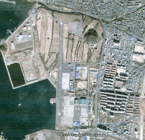해병대의 發祥地인 경남 진해시 德山洞에 위치하고 있는 德山비행장(사진 중앙에 비행장 활주로가 남북으로 보이고 있으며 활주로 주변은 Golf장(9 Holes)으로 되어 있음) 사진의 북쪽이 진해시이며 오른쪽 방향에 天子峰이 위치하고 있으며 왼쪽에 행암만이 검게 보이고 있음. 發祥塔은 사진의 중앙 위쪽에 보이는 동산에 위치하고 있음.