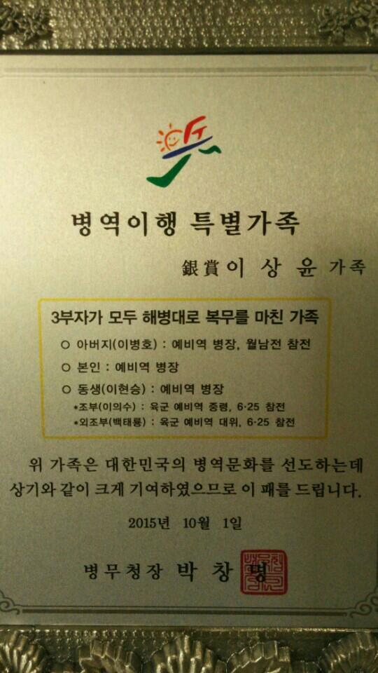 신청인 본인 이xx는 1970년에 해병대에 자원입대하여 13개월간 월남전에 참전(유공자 등록번호 21-1305571)후 연평도에서 잔여기간을 복무하고 전역하였습니다. 본인의 장남 이상윤(해병대1사단 복무)과 차남 이현승(해병대사령부 복무)도 대를 이어 해병대를 명예롭게 전역하였습니다.