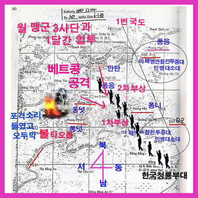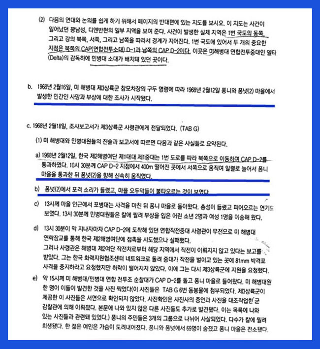 조사보고서 일부이지만 조사내용들을 살펴보자 당시 1,2,3 소대 순으로 일렬 종대 대형으로 퐁니촌을 통과 사병 간 안전거리 5m 유지하면서 이동하기 때문에 앞 뒤에서 무슨 일이 일어나는지 알수 없었고 서쪽 방향 퐁넛촌에서 총소리와 부락이 불타는것을 목격했다 .
