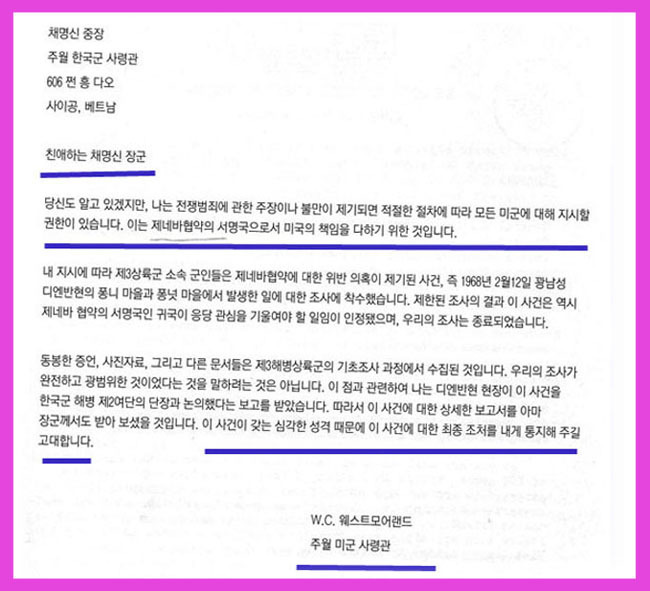 미군 사령관 웨스트모어랜드 장군은 주월 채명신 중장에게 보낸 서신