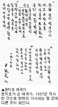 1907년 무렵부터는 윤치호 작사의 애국가가 널리 보급되기 시작했다. 윤치호는 여러 애국가를 참작해 다듬어 작사한 것으로 보인다. 이 가사는 “우리 대한만세” “바람 이슬 불변함은” 등 몇 구절을 제외하고는 오늘날의 애국가 가사와 거의 일치한다.