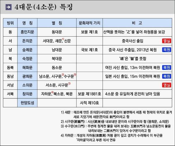 서울을 둘러싼 성에는 4대문과 4소문이 있다.
