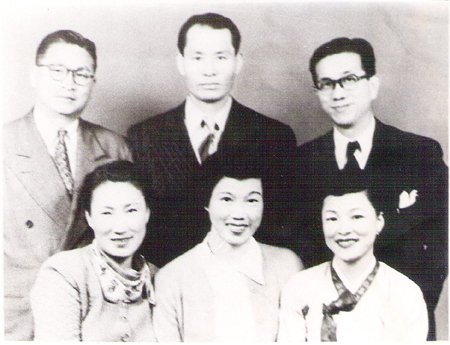 1950년대 뉴욕의 한인들. 앞줄 오른쪽부터 한복입은 김자경, 의사 임길재, 시인 모윤숙, 뒷줄 오른쪽 부터 황재경 목사, 김자경의 남편 심형구 화백, 손원일 제독.