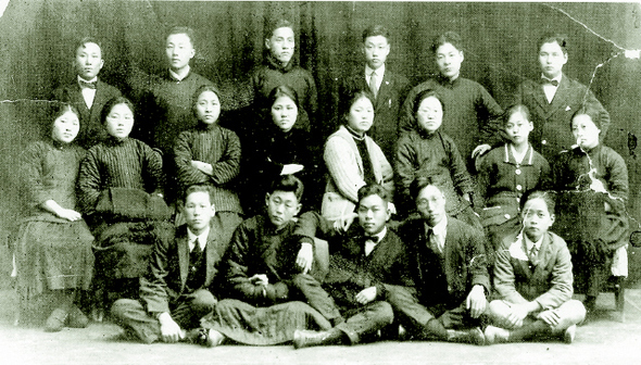 1921년 겨울 상하이의 한국유학생 모임인 화동학생연합회에서 찍은 것으로 추정되는 사진. 맨 앞줄 가운데 보타이를 맨 청년이 박헌영, 둘째줄 오른쪽에서 두번째 일본 여학생 교복을 입은 여성이 현앨리스다. 돌베개 제공