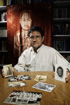 AP PhotoWonil Kim displays old photos of his South Korean mother, Kim Soo-im, at his office in Riverside, Calif., Friday, July 18, 2008. A declassified U.S. Army report from 1950 indicates his mother, executed as a communist spy early in the Korean War, could not have obtained the secret U.S. information she allegedly passed to North Korea. She was "caught up in the torrent of historical turmoil,'' he says. His daughter, Johanna Kim, painted the large portrait of her grandmother.