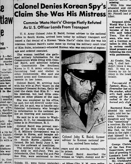 AP PhotoThe now-defunct San Francisco News on July 5, 1950, states that U.S. Army Col. John E. Baird denied that Kim Soo-im, executed as a communist spy, was his mistress. A now-declassified Army investigative report from 1950 says they were lovers, but indicates the allegations against her were unfounded. The "Commie 'Mata Hari' " headline was typical of U.S. news coverage of the case.