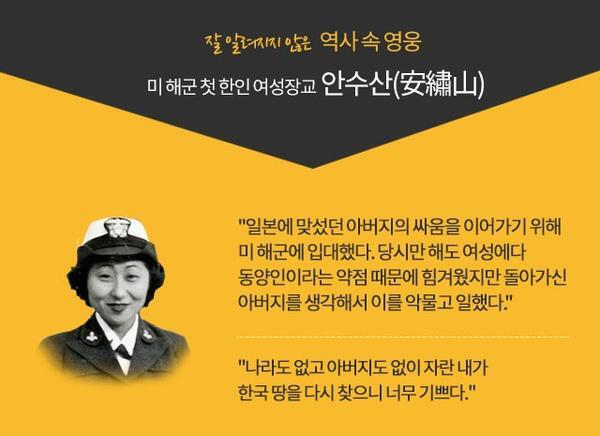 Susan Ahn Cuddy was born in 1915 in Los Angeles, California as the eldest daughter of Dosan Chang Ho and Helen Ahn. Her parents were the first Korean married couple to immigrate to the United States in 1902. All of the Ahn Children were born in California. Her father told his children to: 밆o your best to be good American citizens but never forget your Korean heritage.� As the family established themselves, the Ahn house became a haven for many Korean immigrants. The Young Korean Academy (Hung Sa Dan) made its headquarters at the Ahn′s residence as a resource center for many Korean immigrants. Many exiled Korean patriots, including Soh Chae Pil, the first Korean American citizen, visited the Ahns while they lived at 106 North Figueroa during the Japanese occupation of Korea. The Ahn family also lived at a house on the University of Southern California campus and today it serves as the Korean Studies Institute.