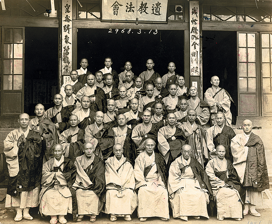 1941년 3월 경성(서울) 선학원에서 열린 유교법회에 참석한 스님들의 기념촬영. 세 번째 줄 맨 왼쪽이 청담스님.