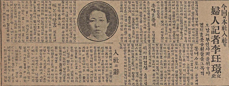 본사가 이미 천하에 고함과 같이 다년간 현안중이던 여자기자의 채용문제가 비로소 해결하게 되었는 바 이번에 부인기자로 입사하게 된 여사는 원래 경성 출생으로 엄숙한 아버지의 교훈과 따뜻한 어머니의 무릎 아래서 장중의 보옥과 같이 黃口(황구)를 겨우 면한 때로부터 새로운 학교교육을 받기 시작하였는 바 그 사람됨이 총명한 중에도 정숙하므로 항상 학교의 온 존경과 온 사랑을 독차지하였었으며 거금 13년 전에 관립 한성고등여학교에 입학하야 대정 4년에 이르러 남의 뛰어나는 조흔 성적으로서 영광스럽게 졸업하얏다>