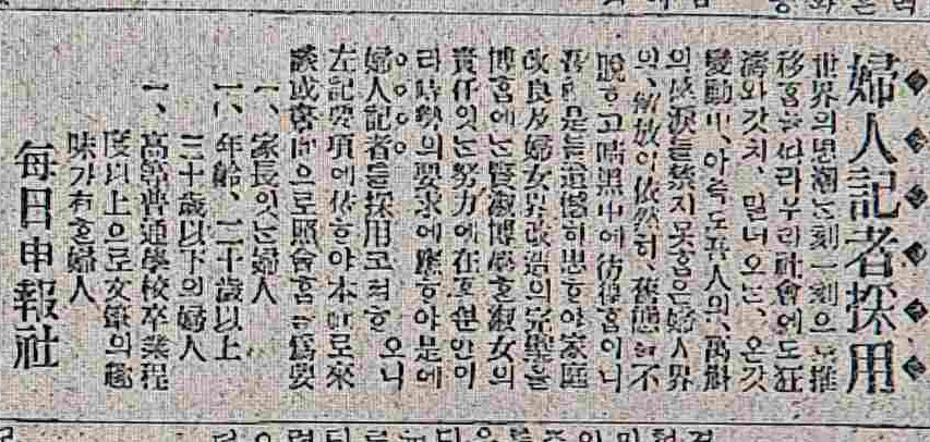 <매일신보>는 1920년 7월 1일 신문에 여기자 공채사고를 내고 우리 나라 최초로 여기자를 채용하게 되었다. 응모자격은 가장있는 부인이라야 하며, 연령은 20세 이상 30세 이하이고, 학력은 고등보통학교 졸업 정도 이상으로 문필에 취미가 있어야 한다.