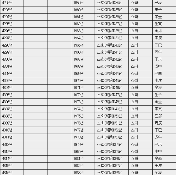 | 단기 | 조선왕조 | 대한제국 | 서기 | 일본 | 일본발음 | 간지 |