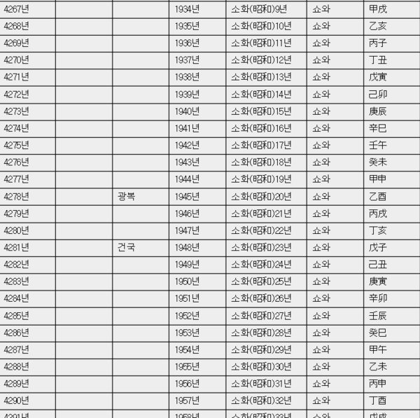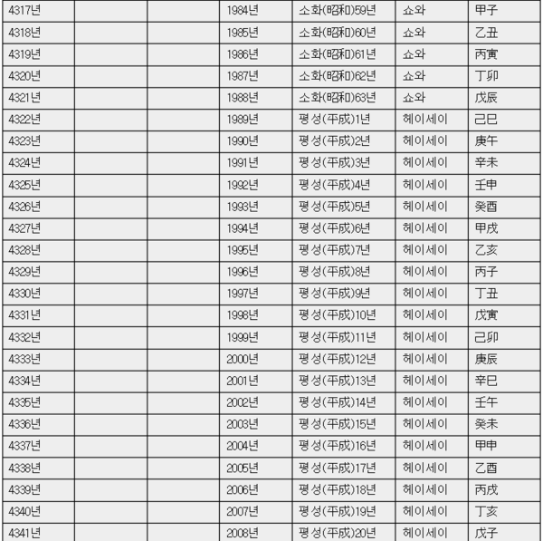 | 단기 | 조선왕조 | 대한제국 | 서기 | 일본 | 일본발음 | 간지 |