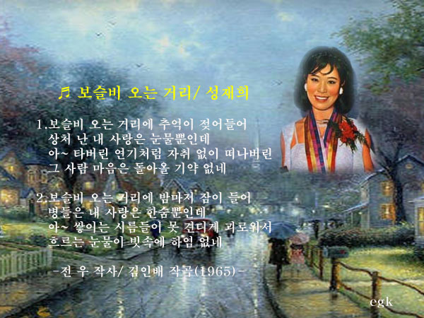 1965년 전우작사 김인배작곡 성재희노래로 발표된 "보슬비 오는 거리"는 발표와 함께