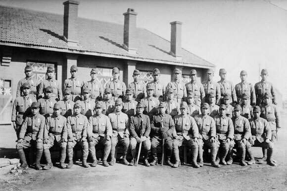 1944년 2월23일, 허난성 일본북지파견군 고로모 부대 훈련소 수료식 사진. 맨 뒷줄 오른쪽에서 네번째가 이혜복.