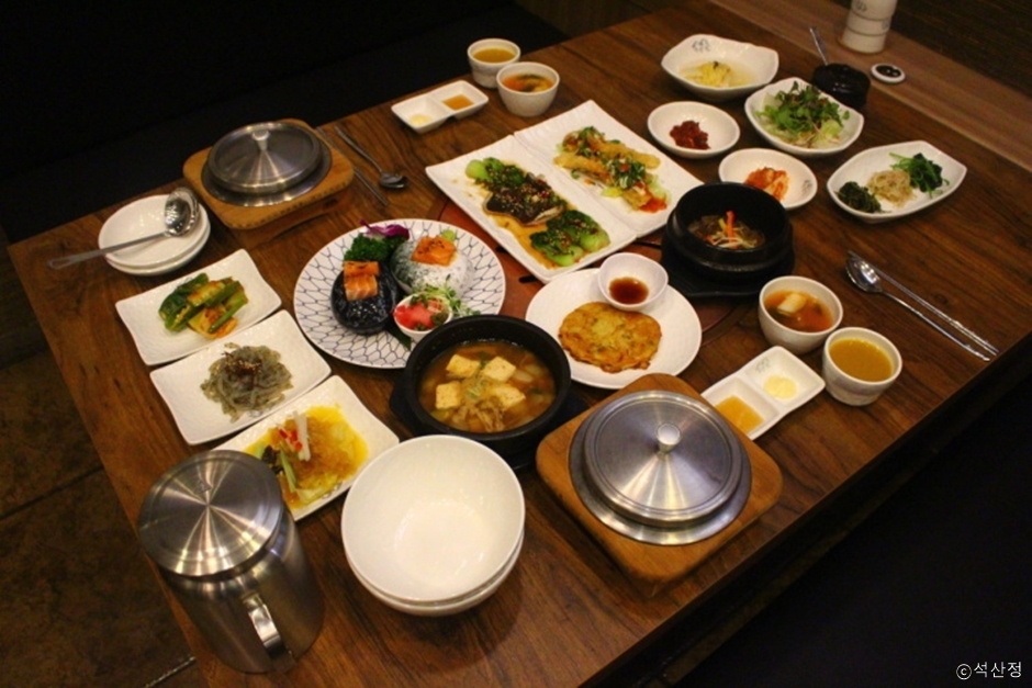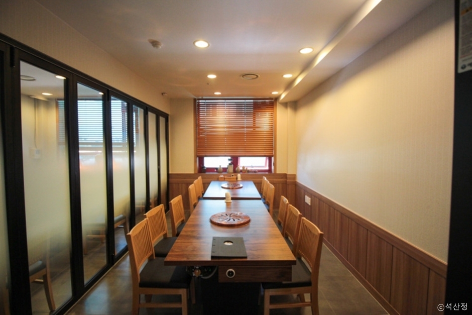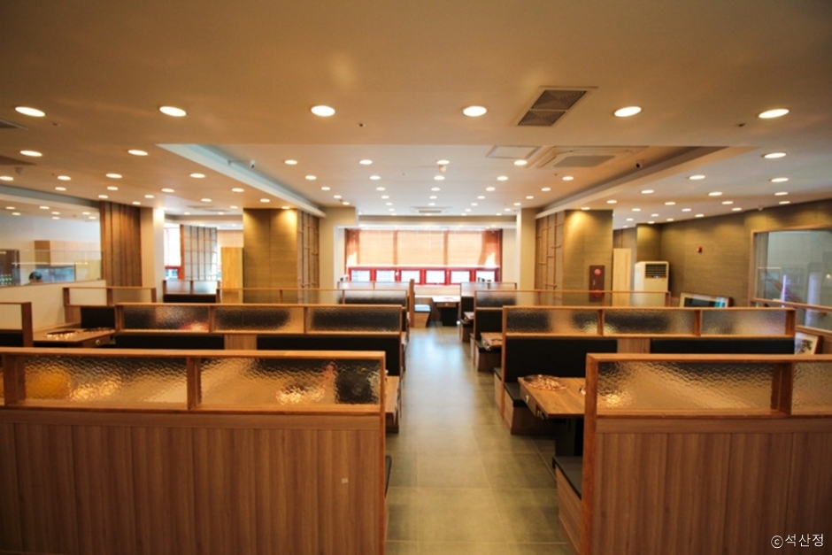 석산정은 수원시 세류동에 있는 40년 전통의 숯불구이 전문점이다. 1호선 세류역 1번 출구에서 1분 거리에 있어 대중교통을 이용해도 좋고 3층 건물에 넓은 주차장이 있어 차로 방문해도 주차 걱정이 없다. 단, 2시간 동안만 무료이고 이후 추가요금이 발생한다. 가족 외식이나 단체 회식을 위해 많이 찾는 곳으로 식당 내부는 넓고 깔끔하다, 테이블마다 파티션 놓여있어 편하고 여유있는 식사를 즐길 수 있다. 또, 다양한 크기의 단독 룸이 있어 예약 후 이용할 수 있다. 대표 메뉴는 생갈비와 양념갈비, 갈빗살과 채끝 등심이 있지만, 생삼겹과 생목살, 파불고기샤브샤브와 곤드레밥정식도 인기다. 특히 오후 3시까지만 주문이 가능한 곤드레 솥밥 정식은 가성비와 가격 대비 만족도를 모두 갖춘 점심 메뉴이다. 고기 주문 시 직원이 직접 굽고 먹기 좋게 잘라줘서 편하고 매장에는 서빙 로봇이 돌아다니고 있어 눈길을 끈다. 식사 후 후식으로 매실차 제공된다.