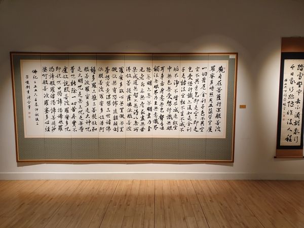 남다른 사연을 지닌 <금강반야바라밀경>도 빼놓을 수 없다. 지난 2010년에 완성된 이 작품은 유 작가의 딸인 성희영씨(28)의 수험생 시절과 함께 해왔다. 유 작가는 성씨가 고등학교 1학년생이었던 시절 공부하는 딸과 함께하겠다는 마음, 수험생 자녀를 둔 부모의 마음으로 밤마다 딸이 공부할 때마다 옆에서 금강반야바라밀경을 써왔다. 성씨가 수험생 생활을 마쳤을 무렵 작품 길이는 가로 11m, 세로 48㎝ 규모에 이르렀다.