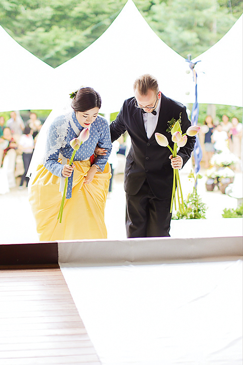 2016년 7월 한여름 용인 대각사에서 열린 두 사람의 결혼식은 사찰 모든 사부대중의 정성어린 손길로 여법하게 치러졌다. 가야금 선율 울리는 가운데 스님은 성혼을 선언하고 곱디 고운 신랑 신부는 연꽃송이 손에 들고 흩날리는 꽃비 속에서 사랑을 맹세했다. 사찰음식 맛나기로 유명한 대각사 공양실에선 시원한 냉면과 다과, 사찰식 디저트를 완비했고 솜씨 좋은 보살님들 덕분에 폐백까지 완벽하게 소화했다.