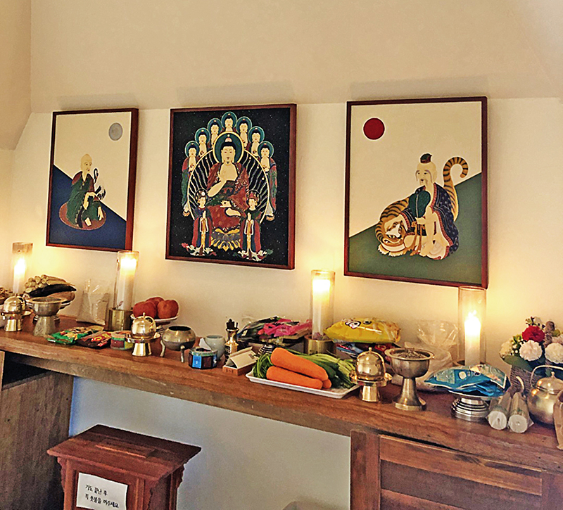 2018년 용인 대각사 삼성각에 그녀 삶의 첫 탱화를 봉안했다. 2020년 108명의 작가들과 함께 연 ‘붓다의 향기’전에서 윤 작가의 작품 ‘All OF US’는 20여 부처님 군상을 모아 불교의 인드라망 세상을 형상화해 눈길을 끌었다. 그녀만의 시선으로 불교문화유산들을 재해석하는 작품을 그려내는 일은 그녀가 정한 버킷리스트 중 하나다. 그걸 실천하려고 스튜디오 ‘하심(下心)’이라는 멍석까지 깔아 놓았다. 올가을에는 서울국제불교박람회에 출전해서 남편과 함께 공들인 작품들을 ‘부처시리즈’와 ‘중생시리즈’로 나눠 선보인다니 벌써부터 기다려진다.