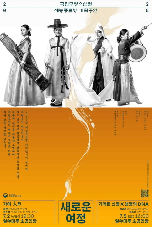 국가유산청 국립무형유산원이 7월2일과 5일 얼쑤마루 소공연장에서 무형유산 예능분야 전승자들의 창작 역량을 강화하고 예술적 협업을 통해 공연 콘텐츠를 발굴하는 ‘예능풍류방’의 올해 첫번째 기획공연을 선보인다.