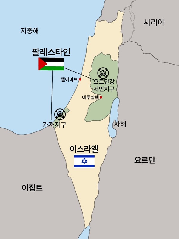 국제사회는 이스라엘-팔레스타인 분쟁을 두고 ‘두 국가 해법’을 제시합니다. 팔레스타인 지역에 유대인 국가와 아랍인 국가가 공존해야 한다는 것입니다. 그러나 이스라엘은 두 국가 해법에서 제시하는 팔레스타인 영토인 서안지구와 동예루살렘을 포기할 생각이 없다는 의견을 재차 밝혔고. 하마스 역시 무장 공격을 통해 이스라엘을 몰아내는 것을 목표로 내세우고 있습니다.