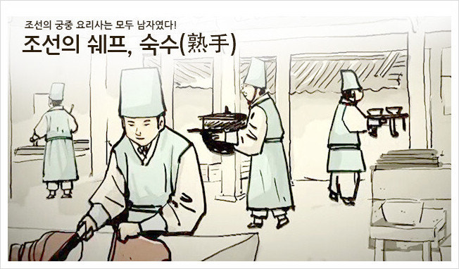 숙수* 대령숙수소주방* 수라간 나인 * 주방상궁 숙수 (熟手) 잔치 때 음식을 전문으로 만드는 직업인. 현재의 조리사와 같은 직업이다. 일상적인 음식은 가정에서 부인들이 직접 조리하나, 잔치 때 많은 음식을 만들고 고배를 할 때 또는 잔칫상을 꾸밀 때는 외부의 남자로서 음식을 만드는 사람을 청하여 일을 시켰다. 이와 같은 직업을 가진 사람을 숙수라 하는데, 특히 궁중에 전속되어 있는 숙수는 대령숙수라 하였다. 대령숙수는 외소주방 또는 잔치 때 가가(假家)로 짓는 숙설소에서 음식을 만들었다. 이들은 궁중의 주방상궁이 궁안에서 살며 궁밖에서 13세 정도의 소녀를 데려다 제자로 삼고 15년간 훈련시켜 계승을 시키는 것과는 달리, 궁밖에서 장가들고 살림을 하면서 궁궐로 출퇴근을 하였으며, 또 10여세의 아들..