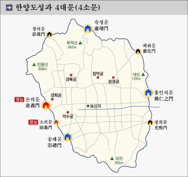 4대문 사이에 4소문을 세웠다. 남대문과 서대문 사이에 소의문(昭義門-서소문), 서대문과 북문 사이에 창의문(彰