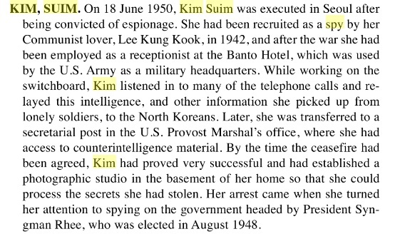 김수임과 친분을 맺었던 그 많은 여성 인텔리들은 지식인이 가져야 할 용기와 관용을 보이지 않았다. 김수임을 미군정 헌병사령관과 맺어준 이화여전 선배 모윤숙조차 그랬다. 당시 모윤숙은 미군 고급장교들을 상대하는 사교클럽을 만들어 후배들을 미군의 품에 안겨주었다. 정말 낯 뜨거운 여성운동사의 일부다.