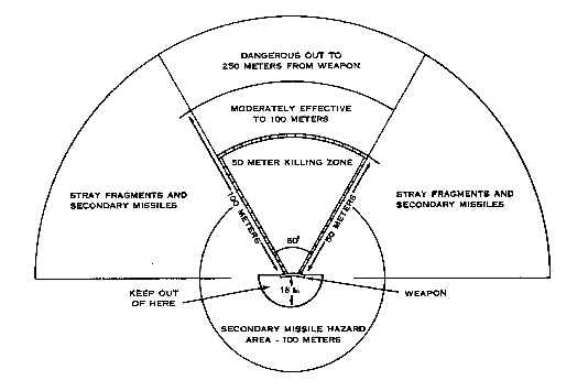 The Claymore projects a fan-shaped pattern of steel balls in a 60-degree horizontal arc, at a maximum height of 2 meters, and covers a casualty radius of 100 meters. The optimum effective range (the range at which the most desirable balance is achieved between lethality and area coverage) is 50 meters. The forward danger radius for friendly forces is 250 meters. The backblast area is unsafe in unprotected areas 16 meters to the rear and sides of the munition. Friendly personnel within 100 meters to the rear and sides of the munition should be in a covered position to be safe from secondary missiles.