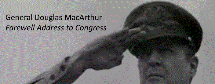 American Rhetoric: General Douglas MacArthur -- Farewell Address to CongressGeneral Douglas MacArthur Farewell Address to Congress delivered 19 April 1951, Washington, D.C. Audio mp3 of Address Your browser does not support the audio element. click for pdf [AUTHENTICITY CERTIFIED: Text version below transcribed directly from audiowww.americanrhetoric.comWho Is MacArthur?The objective of the Memo..
